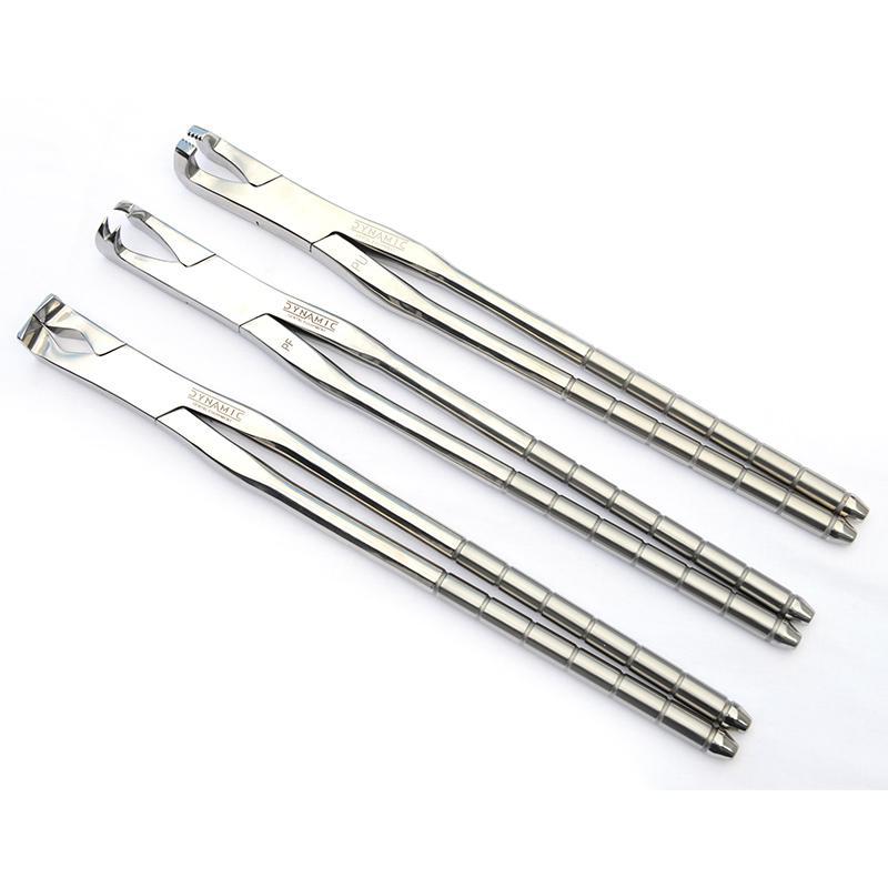 NEW! Updated forceps kit for 2024. Stainless steel forceps designed to fit the smallest equine teeth. Set of 3. Includes, 4 Root, Serrated and Spreader.